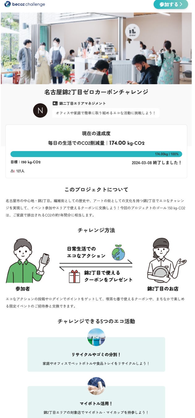 データサイエンスで企業と社会の課題を解決する株式会社DATAFLUCT(本社所在地:東京都渋谷区、代表取締役CEO:久米村 隼人、以下DATAFLUCT)は、名古屋市が主催するなごやまちなか実証「NAGOYA CITY LAB」において、当社の「becoz challenge」を活用した実証実験「名古屋錦二丁目ゼロカーボンチャレンジ」を実施しました。約1.5ヶ月で127名の参加者により約174kgのCO₂排出量を削減、参加者へのクーポン発行にあたり4事業者からの協力いただきました。