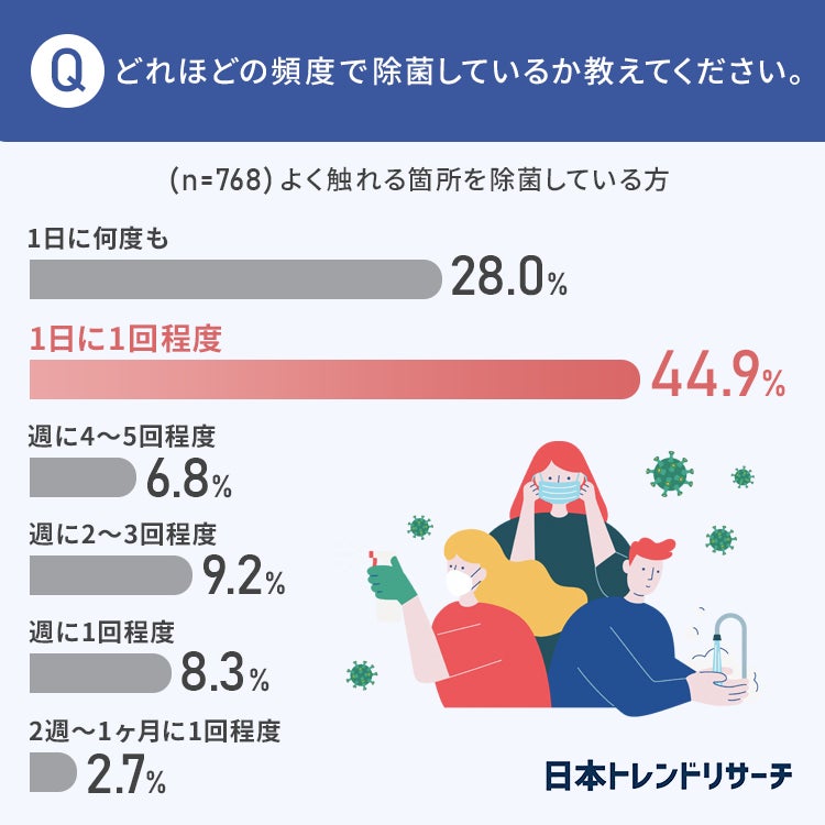 「1日に何度も」が28%、「1日に1回程度」が44.9%と、合わせて7割以上の方が1日に1回以上は除菌しているようです。