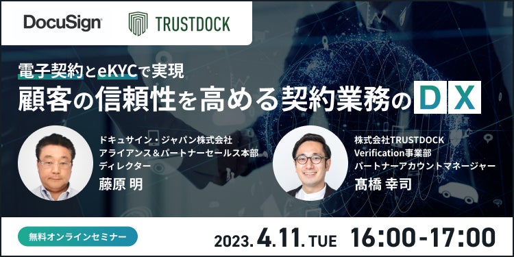 株式会社TRUSTDOCK(本社:東京都千代田区、以下TRUSTDOCK)とドキュサイン・ジャパン株式会社(本社:東京都港区、以下ドキュサイン)は、無料ウェビナー「電子契約とeKYCで実現、顧客の信頼性を高める契約業務のDX」を2023年4月11日(火)に開催いたします。