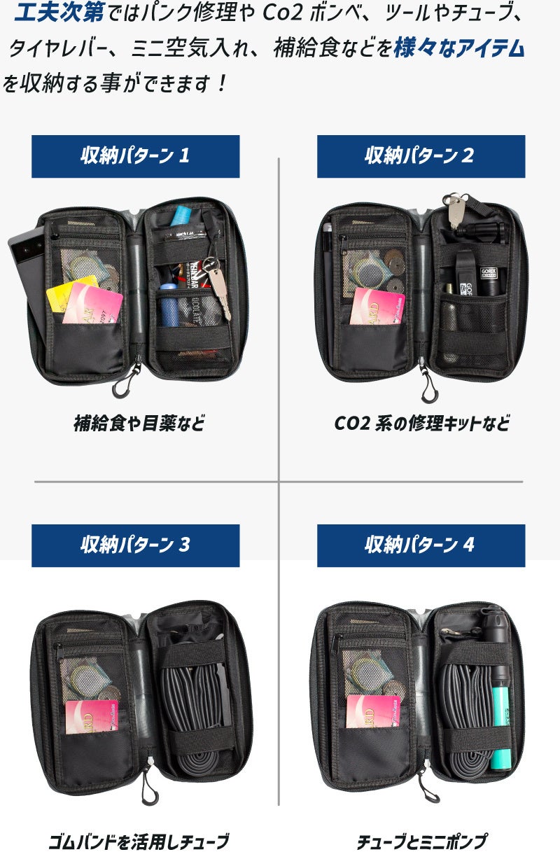 また工夫次第ではパンク修理やCo2ボンベ、ツールやチューブ、タイヤレバー、ミニ空気入れ、