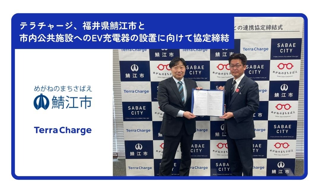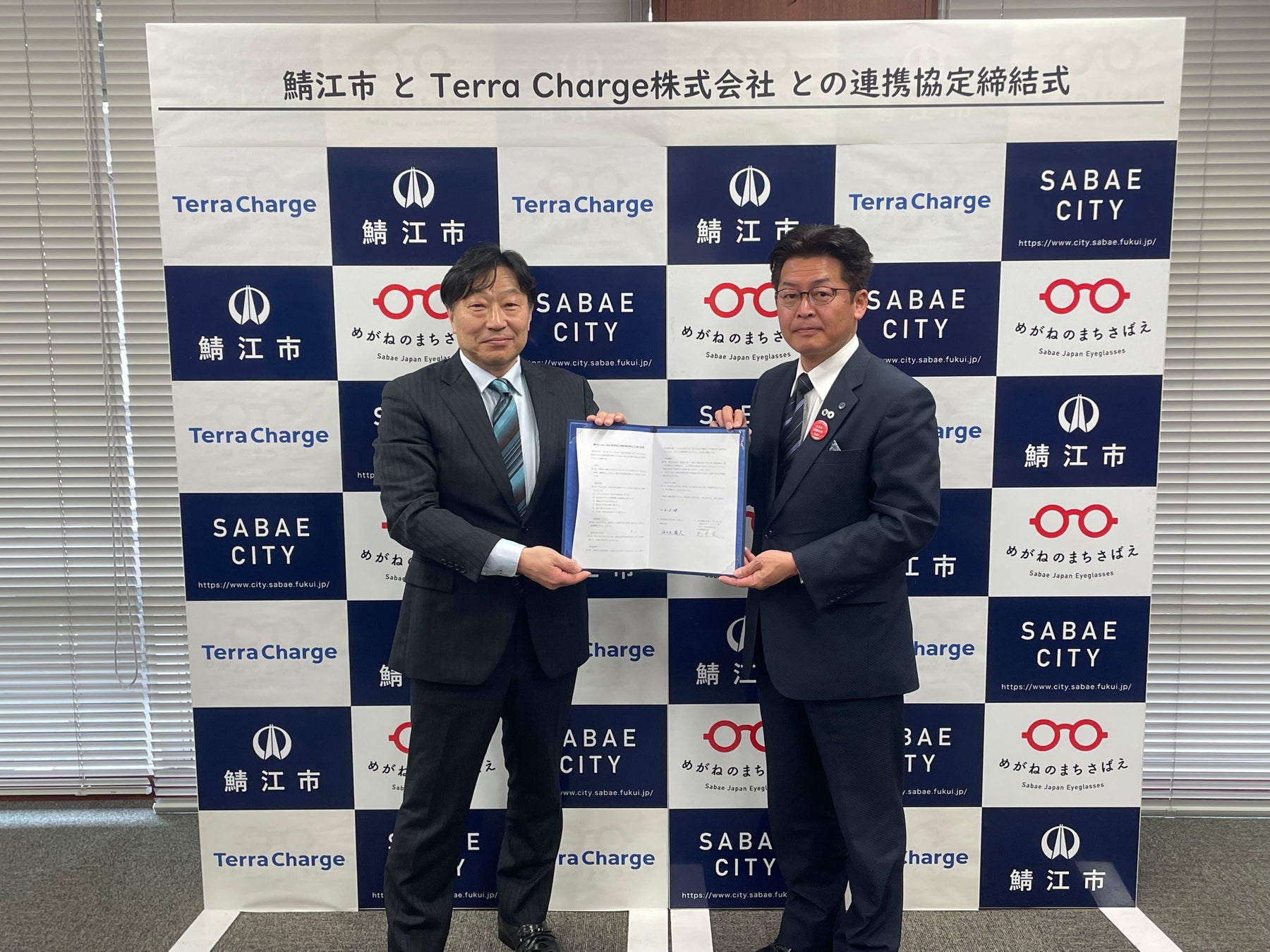 EV充電インフラ事業「Terra Charge(テラチャージ)」を展開するTerra Charge 株式会社(本社:東京都港区、代表取締役社長:徳重徹、以下「当社」)は、福井県の鯖江市(読み:さばえし)と、「鯖江市とTerra Charge株式会社との連携協定」(以下「本協定」)を2024年3月28日に締結したことをお知らせします。
