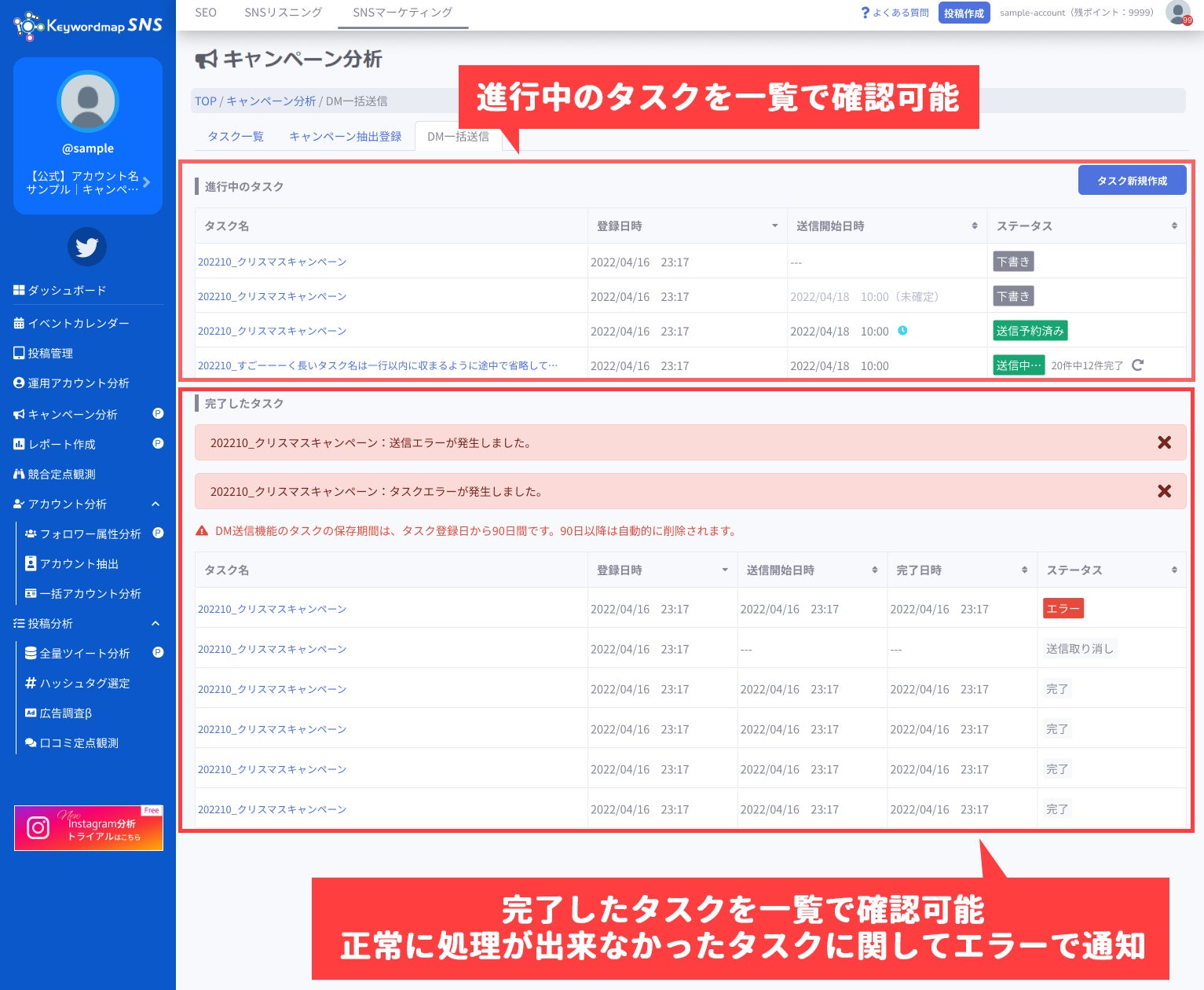 管理画面では、DMの一括送信を予定しているタスク・完了したタスク・正常に送信ができずエラーとなったタスクが一覧表示されます。