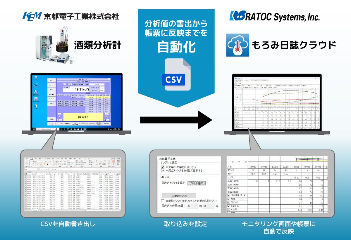 もろみ日誌クラウドは品温計測から帳票作成までを自動化できますが、帳票に必要な品温以外の分析値はこれまで手入力でした。また、SDKシステム・SOFT-CAPから出力するCSVファイルを使用する際はExcelなどに読み込み、個別で帳票データに加工する必要がありました。