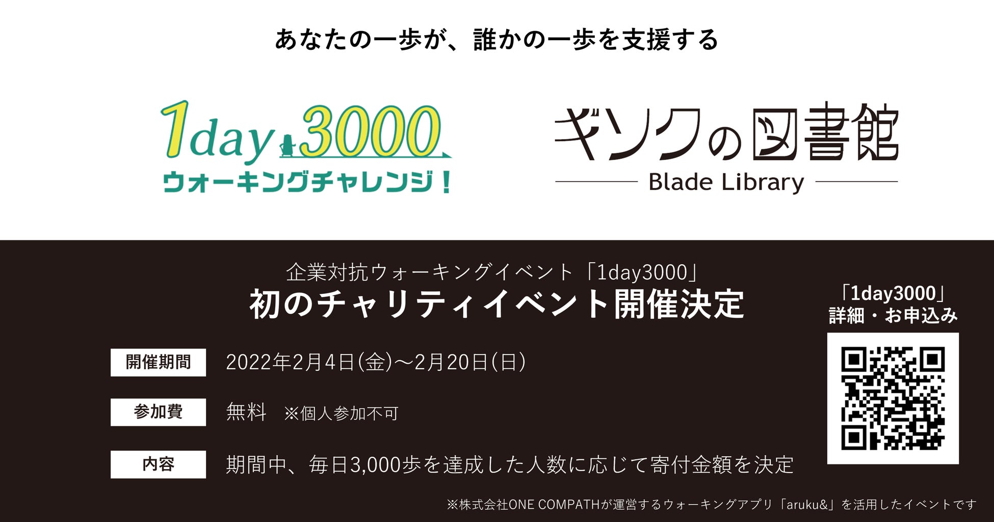 凸版印刷株式会社のグループ会社である株式会社ONE COMPATH(ワン・コンパス、本社:東京都港区、代表取締役社長CEO:早川 礼 ※1)が運営するウォーキングアプリ「aruku&(あるくと)」 (※2)は、テレワーカーの運動不足解消を目的とした無料の企業対抗ウォーキングイベント「1day3000ウォーキングチャレンジ(以下1day3000)」第6弾を、2022年2月4日~2月20日に開催します。6回目となる今回は初のチャリティイベントとなり、イベント期間中に毎日3,000歩を達成した人数に応じて、スポーツ用義足の普及活動をする特定非営利活動(NPO)法人「ギソクの図書館」に寄付します。
