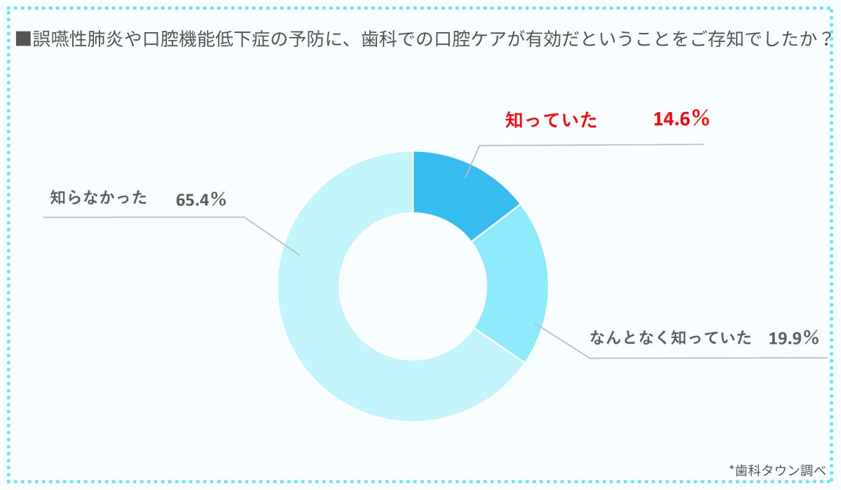 「誤嚥性肺炎や口腔機能低下症の予防に、歯科での口腔ケアが有効だということをご存知でしたか?」という質問に対し、「知っていた」と答えた人はわずか14.6%という結果になりました。65.4%の人は「知らなかった」と回答しています。