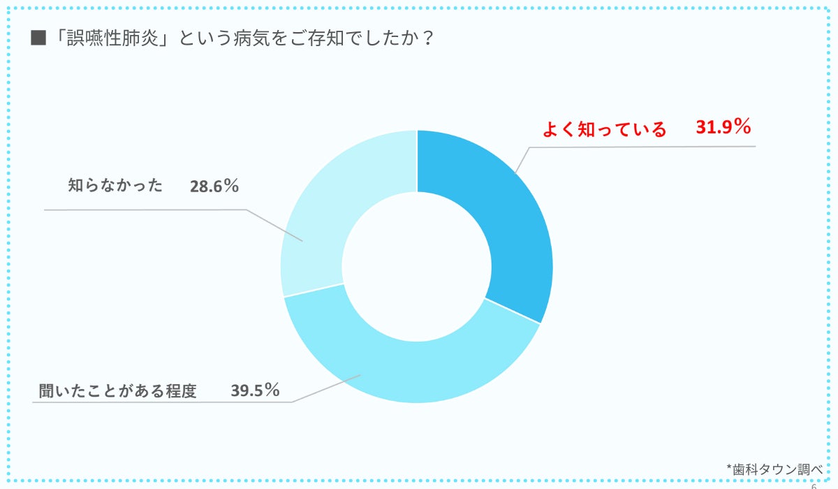 「誤嚥性肺炎という病気をご存知でしたか?」という質問に対し、「よく知っている」と回答した人が約30%、「聞いたことがある程度」と回答した人が約40%となり、合わせると約7割の人が誤嚥性肺炎を認知していることがわかりました。