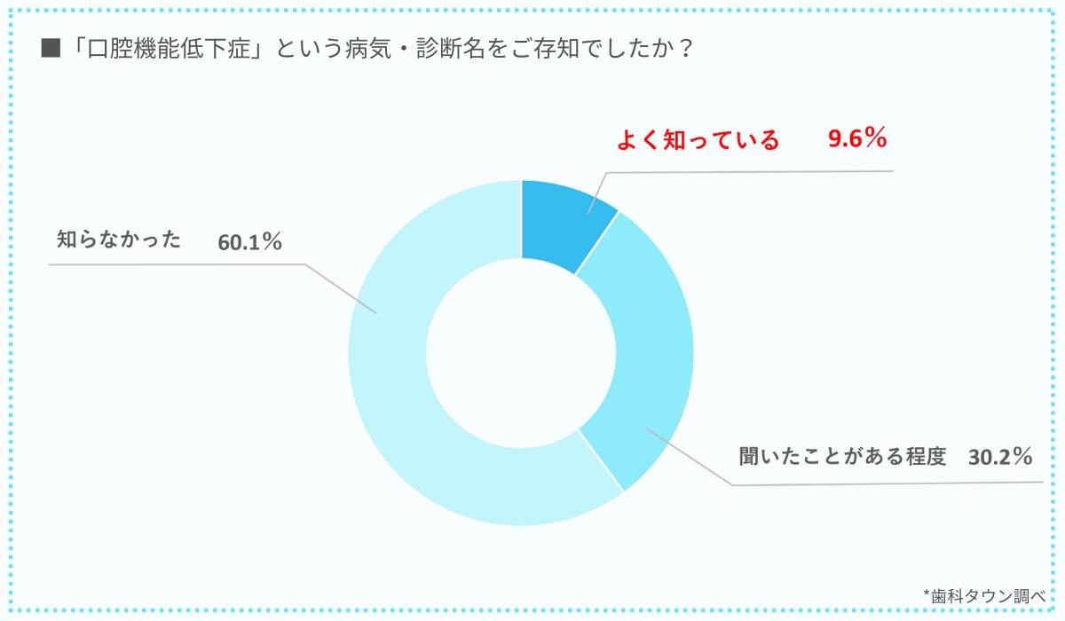 一方、「口腔機能低下症という病気・診断名をご存知でしたか?」という質問では、「よく知っている」と答えた人は9.6%、「聞いたことがある程度」と答えた人は30.2%にとどまり、認知率は約40%という結果になりました。誤嚥性肺炎の認知度は高いものの、その主な原因の一つである口腔機能低下症については認知が十分に進んでいない現状が明らかになりました。