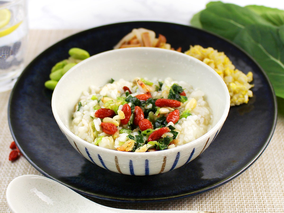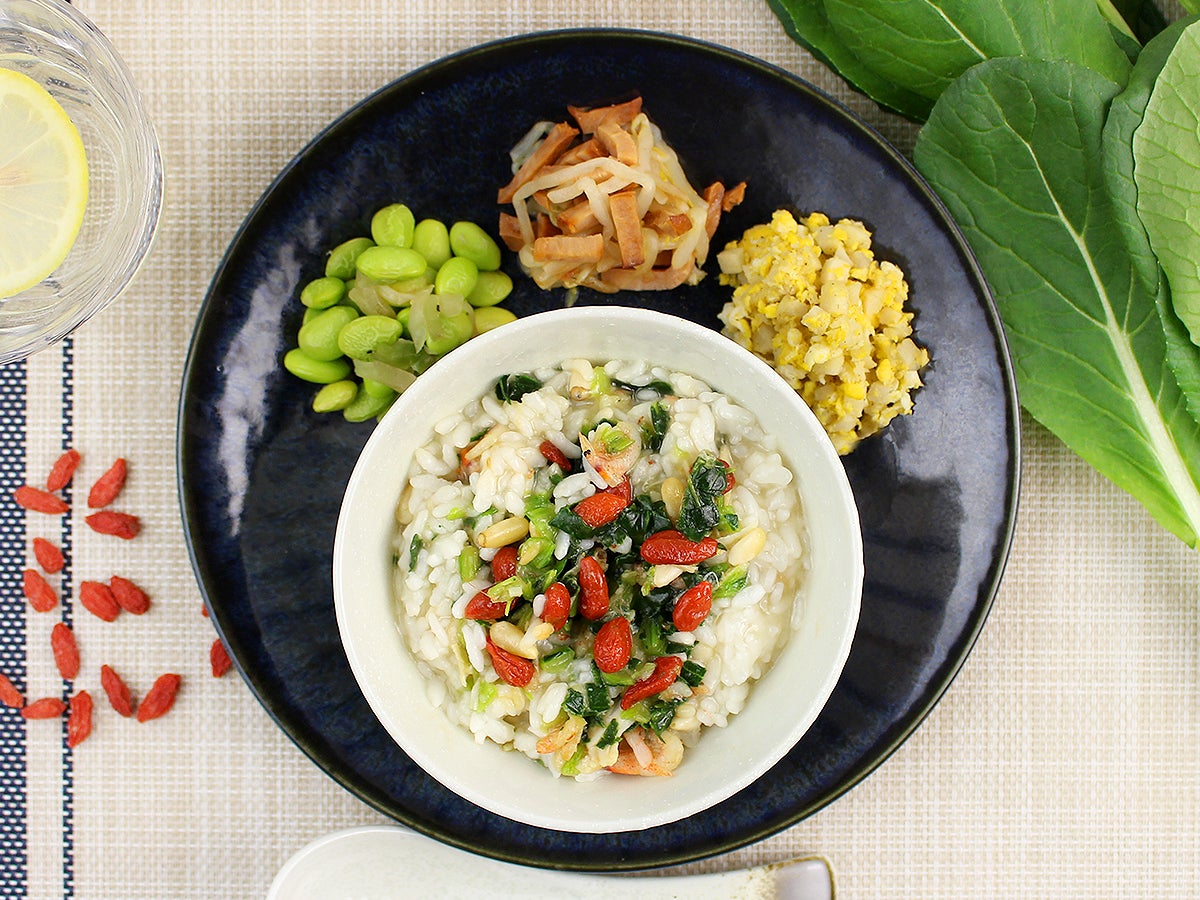 副菜は、枝豆ザーサイ、もやしの辛味和え、里芋と卵の胡椒風味です。こちらの副菜3種はお粥と混ぜて味変食材としてもお楽しみいただけます。