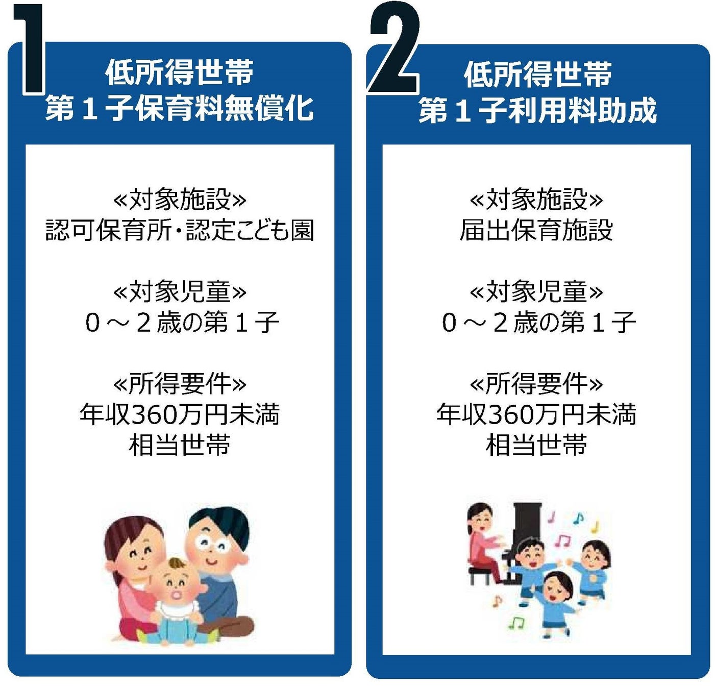 子育て世代の経済的な負担軽減のため、認可保育所・認定こども園において、低所得世帯(年収360万円未満相当世帯)の第1子保育料を無償化。