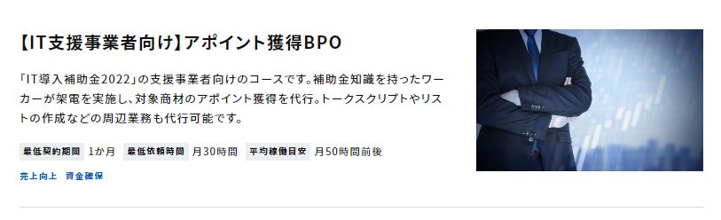 このような背景を受け、「【IT支援事業者向け】アポイント獲得BPO」の提供を開始いたします。