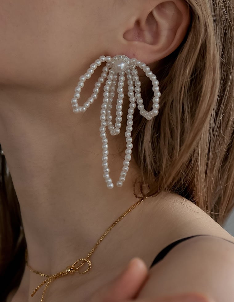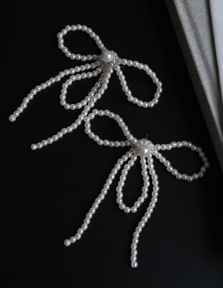 小さめのフェイクパールが繊細に繋がり、美しいリボンモチーフを形成したピアス。