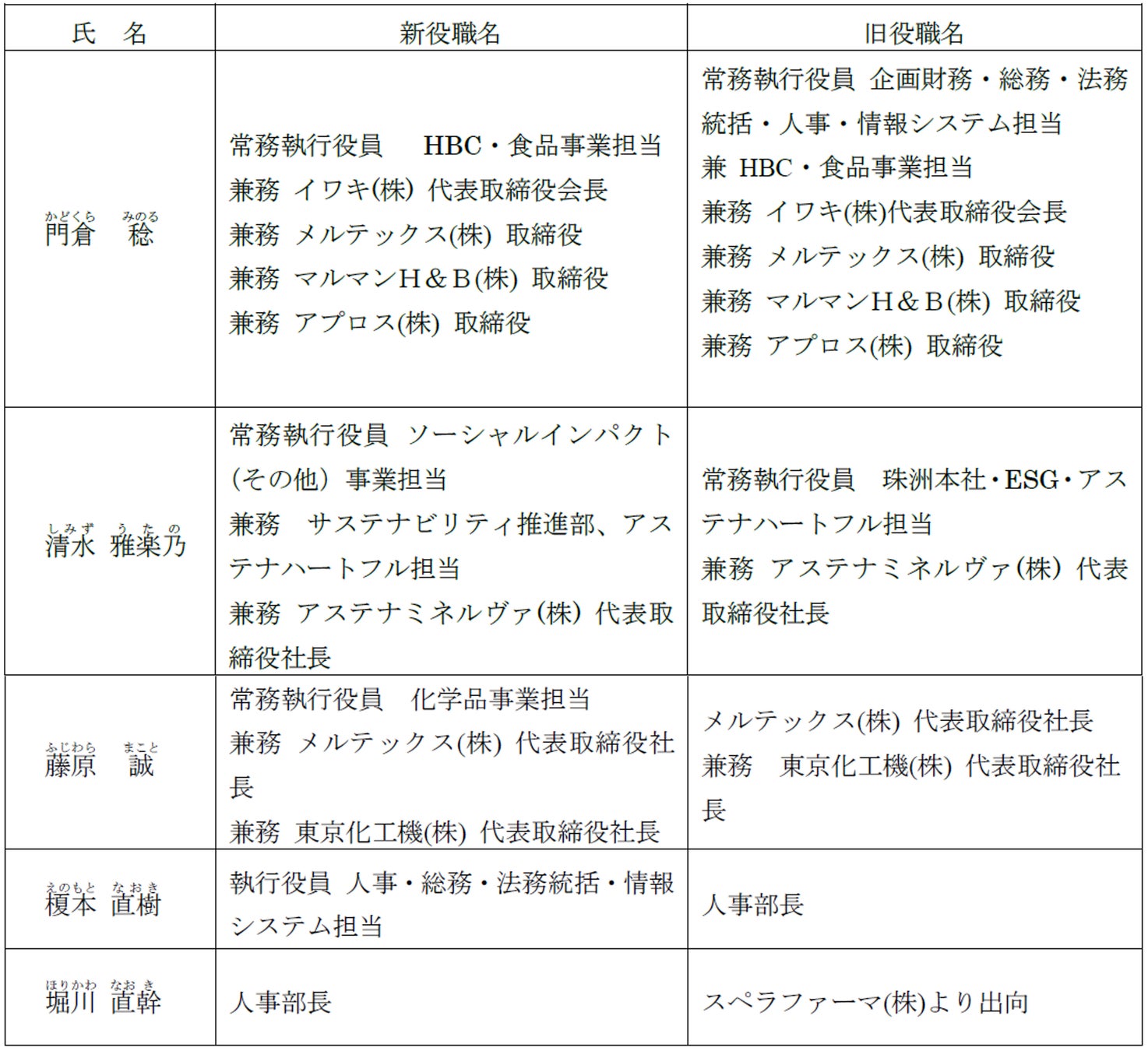 アステナホールディングス株式会社(本社:東京都中央区、代表取締役社長:瀬戸口 智、証券コード:8095)は、2024年2月28日開催の取締役会において、下記のとおり取締役の委嘱業務の変更、組織変更及び人事異動について決議いたしましたので、お知らせいたします。