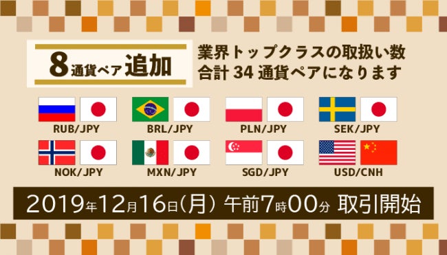 本日よりお客さまよりご要望の多かった「ロシアルーブル/円」、「ブラジルレアル/円」、「メキシコペソ/円」をはじめとした対日本円の通貨ペアを中心に通貨ペアを拡充致しました。取扱通貨ペアは8通貨ペア追加され、合計34通貨ペアとなり、業界トップクラスの取扱数となります。(2019年12月13日当社調べ)