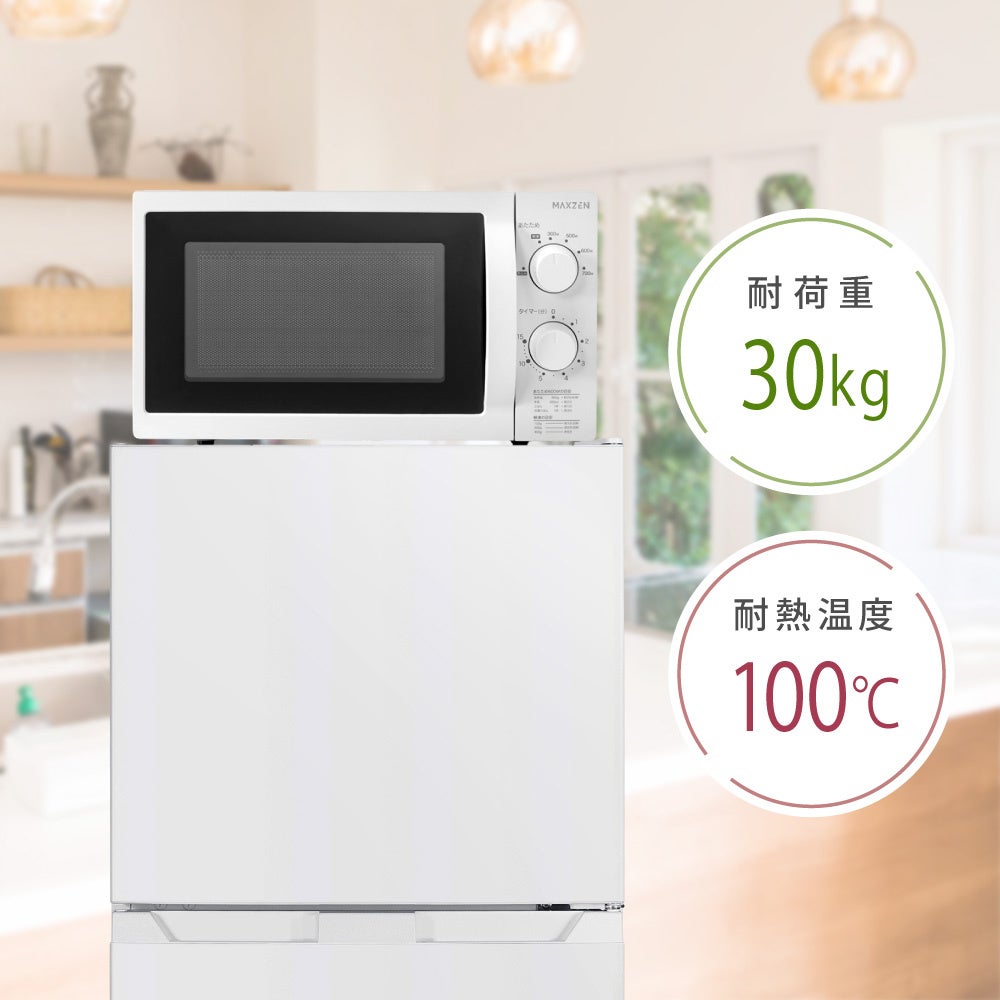 天板は耐熱温度100℃、耐荷重30kgの耐久性を有しており、電子レンジをぴったりと置くことができます。