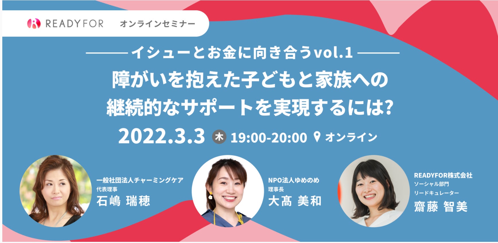 日本初・国内最大級のクラウドファンディングサービス「READYFOR」を運営するREADYFOR株式会社 は、2022年3月3日(木)にウェビナー「~イシューとお金に向き合う vol.1~ 障がいを抱えた子どもと家族への継続的なサポートを実現するには?」を開催いたします。