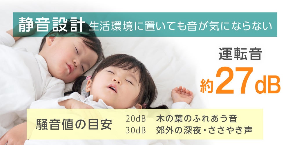 運転⾳は約27dbで、とても静かです。赤ちゃんや小さなお子様がいらっしゃるご家庭でもお子様のお昼寝の邪魔をせず安心してお使いいただけます。また、⼀⼈暮らしの⽅のお部屋や個室などの限られた空間にもおすすめです。