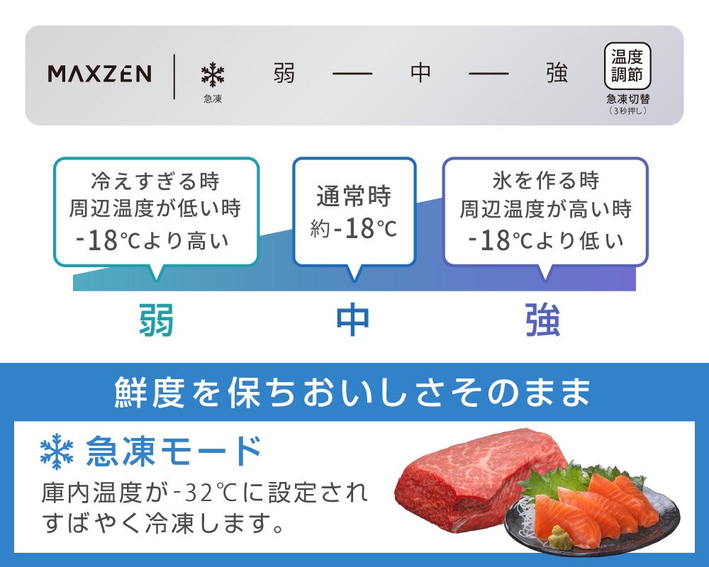 操作パネルでは庫内温度の調節や急凍モードへの切り替えができます。温度は弱・中・強の三段階で、食品が冷え過ぎたとき、氷を作るとき、周辺温度が変わったときなど、シチュエーションに合わせて調整いただけます。また、急凍モードでは、庫内温度が-32℃に設定され、食品の鮮度を保つために素早く冷凍します。