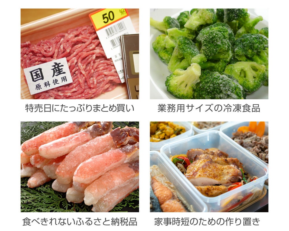 食品をたっぷり保存できる容量、食品ごとに整理整頓できる5段収納、急冷も可能な温度調整機能など、これまでご紹介いたしました機能の通り、正にお好みの食品を保管するための専用冷凍庫として作られたと言っても過言ではない製品となっております。特売日のまとめ買い、業務用のビッグサイズの冷凍食品、駆け込みで限度額ギリギリまで購入したふるさと納税の返礼品、家事の時間を短縮するために大量に作ったおかずの作り置きなどを保管する、専用の冷凍庫にピッタリな、2台目の冷凍庫としておススメできる製品です。