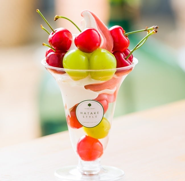 大粒のさくらんぼとシャインマスカットを盛り付けた豪華なパフェ。濃厚なソフトクリームがフルーツを引き立てます。