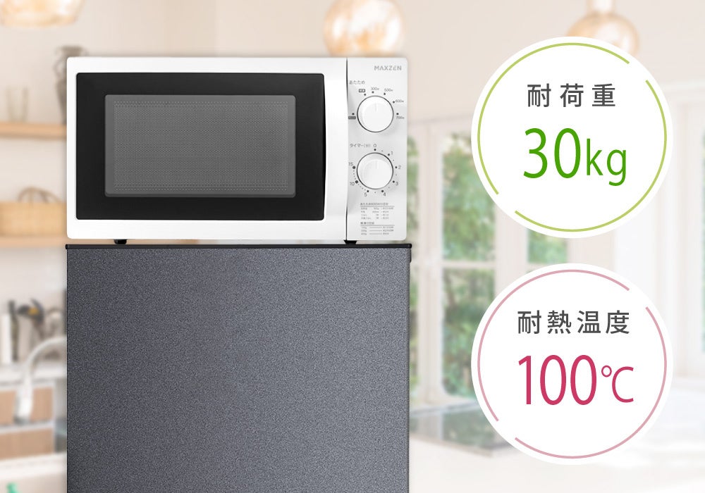 天板は耐熱温度100℃、耐荷重30kgの耐久性を有しており、電子レンジがはみ出ることなくすっきり収納することができます。