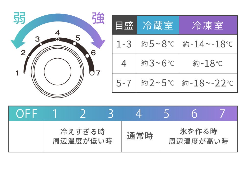 温度調整はダイヤル式なので、どなたでも簡単に、直観的に操作をすることができます。7段階の調節が可能で、冷蔵庫の周辺温度が変化したときや氷を作るとき等、状況に合わせた温度調整を可能にしています。