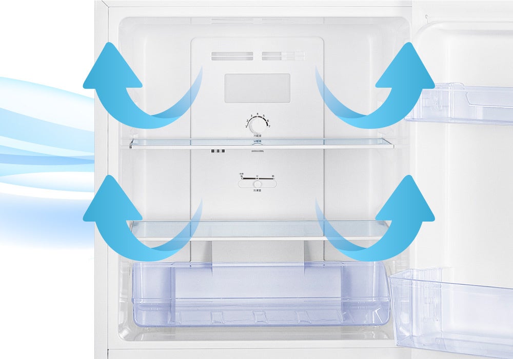 自動で霜取りを行うファン式自動霜取りを採用しております。冷気を全体にムラなく広げることで、面倒だったお手入れが楽チンになります。