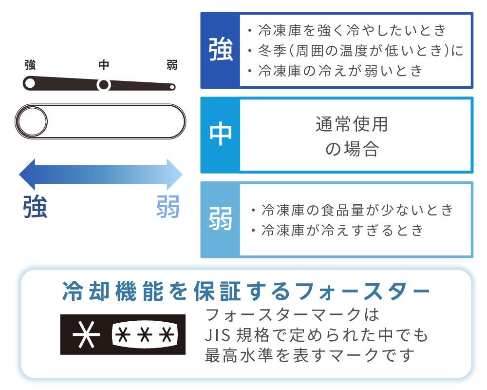 冷凍室と冷蔵室の冷気の配分は、弱・中・強の3段階に調節することができます。また、冷却機能については、JIS規格最高水準のフォースターが付与されています。
