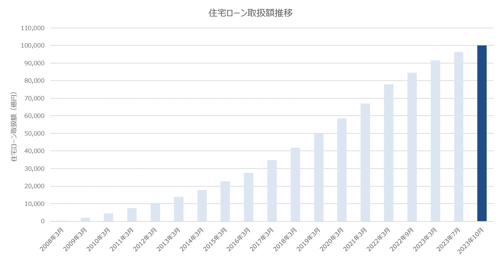 ※1 取扱額とは、住信SBIネット銀行が販売する住宅ローン、住信SBIネット銀行が三井住友信託銀行株式会社(以下「三井住友信託銀行」という)の銀行代理業者として販売する住宅ローン(「ネット専用住宅ローン」)、「フラット35(買取型)」、「フラット35(保証型)」各融資実行額の合計です。「ネット専用住宅ローン」は三井住友信託銀行の商品であり、2023年9月29日をもって、新規お借入れを終了しております。
