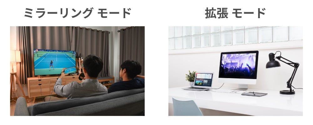 本製品は「ミラーリングモード」「拡張モード」の2種類に対応。動画やゲームが大画面で楽しめるほか、ノートPCの作業効率化にも活用できます。