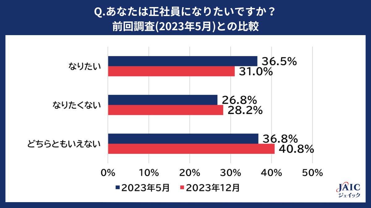 2023年5月に実施した調査(※1)の結果と比較したところ、「なりたい」が5.5ポイントダウンしたのに対し、「なりたくない」が1.4ポイント、「どちらともいえない」が4.0ポイントアップする結果となりました。