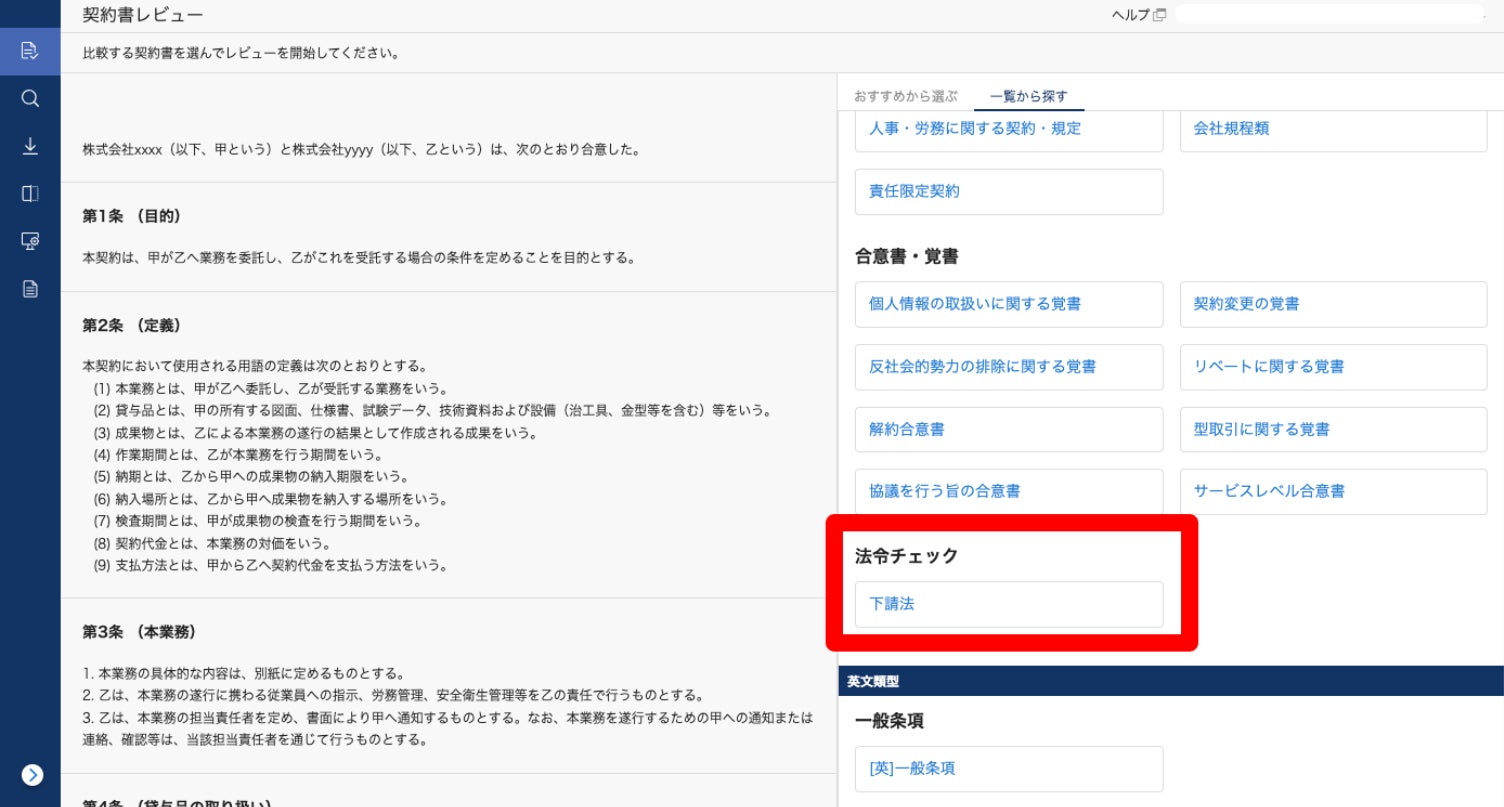 下請法の適用となる契約をする際に気をつけるべきことも多く盛り込まれており、それらの洗い出しや抜け漏れチェックが簡単にできるようになります。
