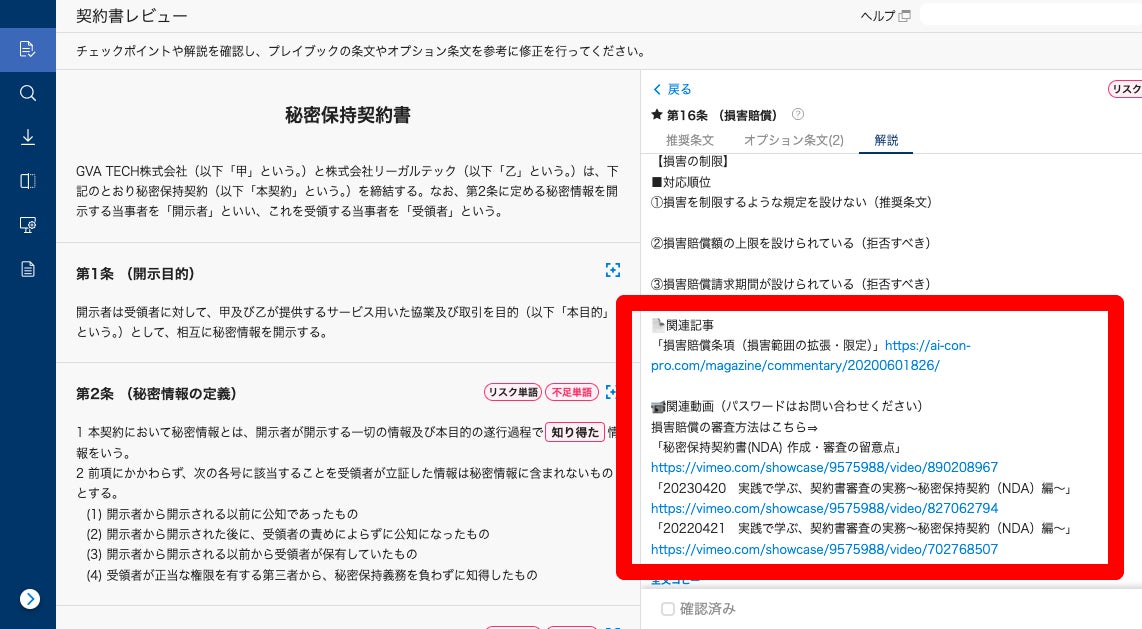 今回のリリースでは、実際に契約書のレビューをしながらそれらのコンテンツを参照できるように、GVA プレイブックの以下の類型の解説欄にリンクを追加しました。
