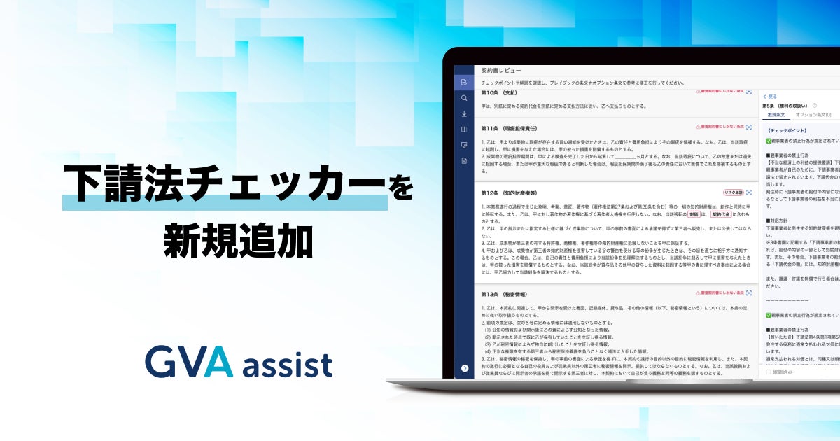 GVA TECH株式会社(本社:東京都渋谷区、代表取締役:山本 俊、以下GVA TECH)は、AI契約書レビュー支援クラウド「GVA assist(ジーヴァ アシスト)」に標準搭載しているGVA プレイブックに、下請法チェッカーを追加したことをお知らせします。今回のアップデートにより、下請法の適用となる取引において、法令違反となる箇所がないかチェックすることができるようになります。