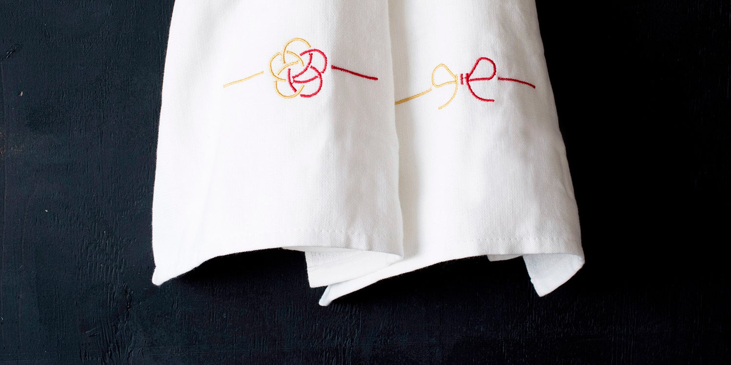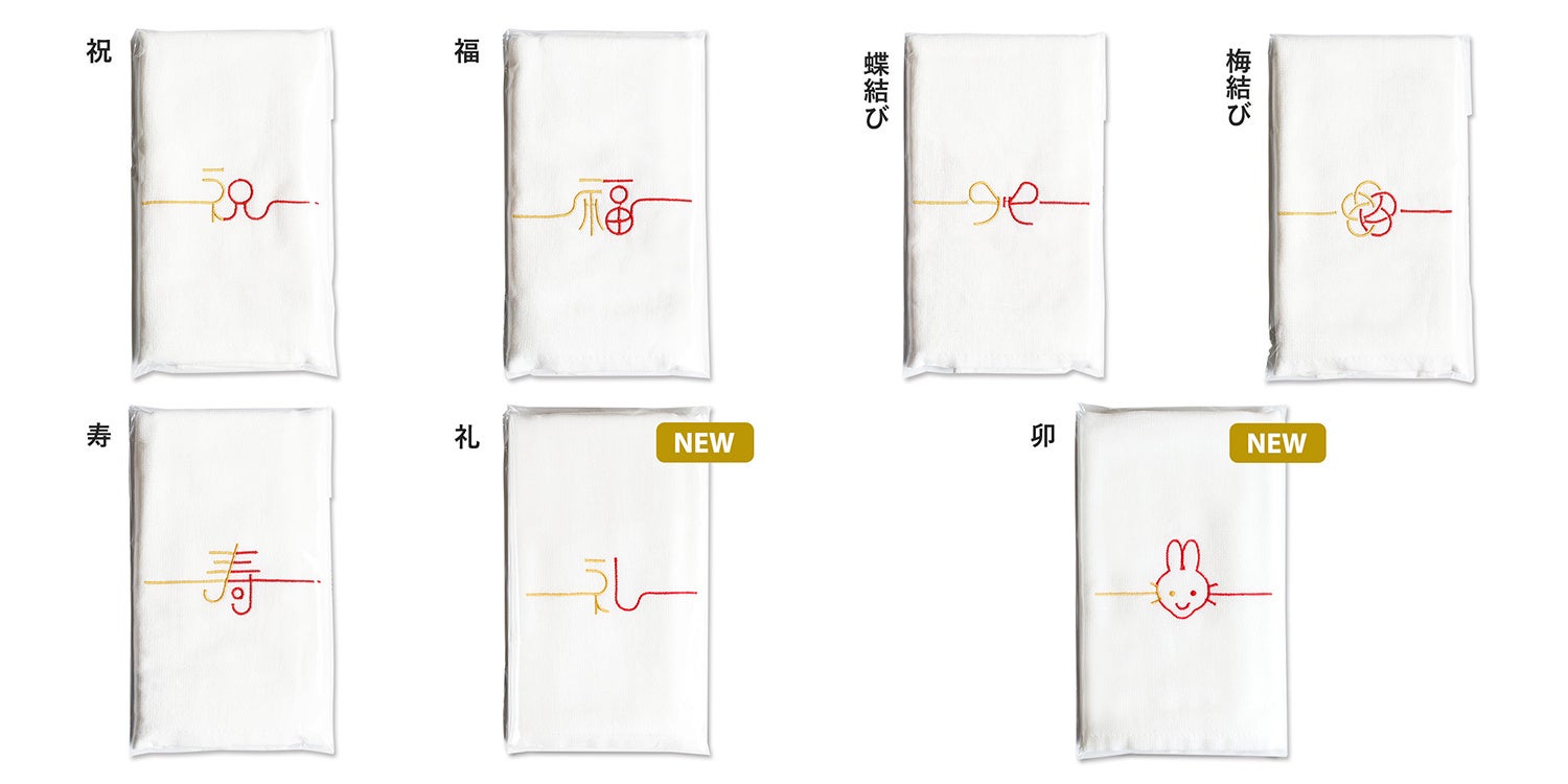 お配りに合う文字を厳選し、刺繍で水引きを表現しました。水引きの定番、梅結びと蝶結びもございます。