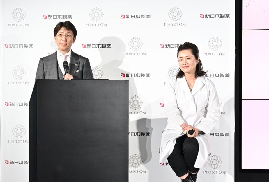 美容皮膚科医の宇井先生が「ビタミンPPとプロビタミンB5 ※5という2種類のビタミンを配合している点が注目すべきところ。」などと説明すると、藤本さんは「日本で唯一 ※3のオールインワンスキンケアであり、今注目の成分も配合しているということを周りに教えてマウントを取りたいです。30代40代は忙しく肌悩みも多い世代。みんなにパーフェクトワンを使って欲しい」とコメントしていました。