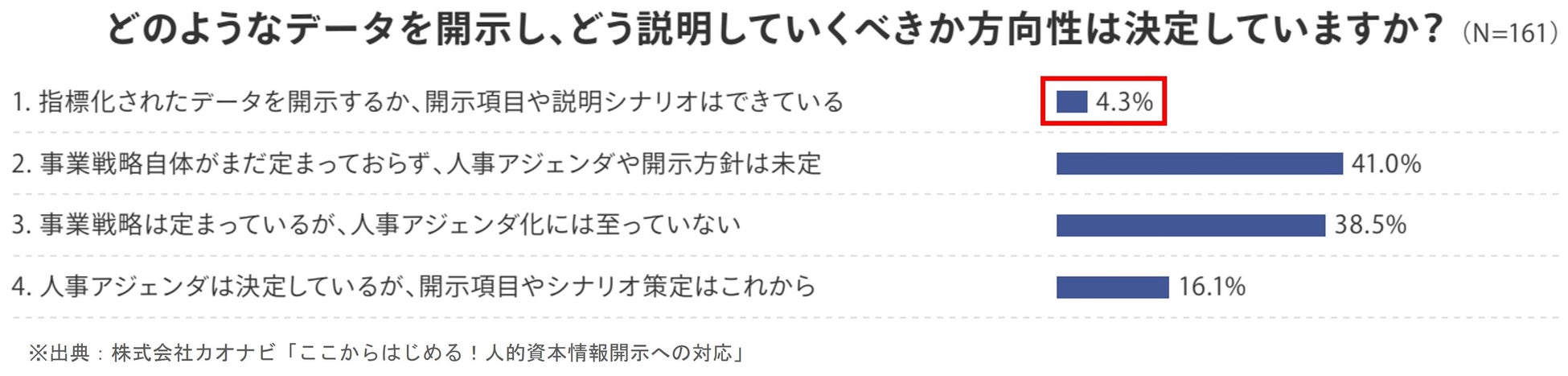 開示項目や説明シナリオへの準備ができていると回答した企業はわずか4%しかおらず、ほとんどの企業が情報開示への対応が進んでいないことが分かります。