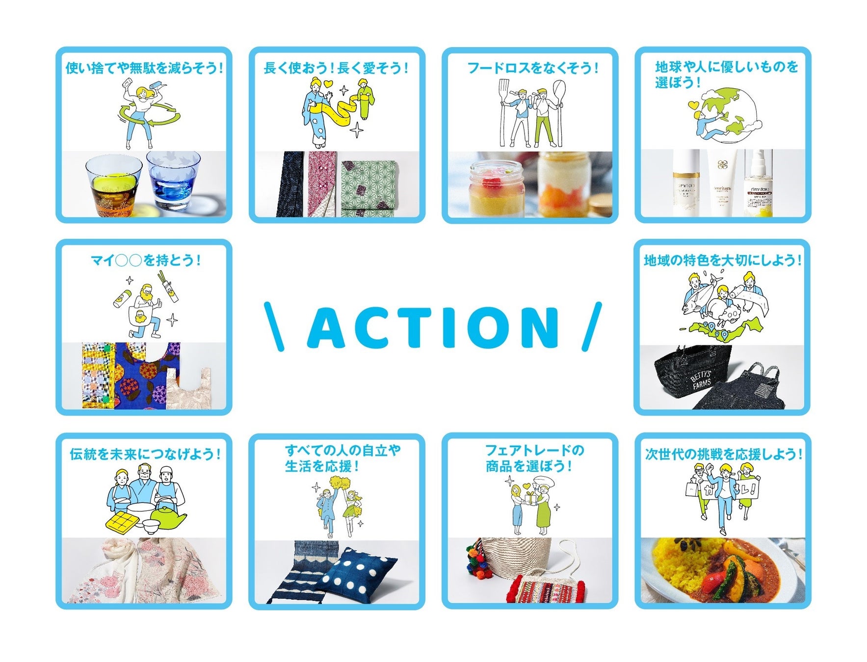 地球、社会、そして人々にとって、より良い未来をつくっていくために、今回は、「使い捨てない、無駄にしない、ゼロウェイストな暮らし」というテーマを中心に、「フードロスを無くそう!」「地球や人に優しい物を選ぼう!」「すべての人の自立や生活を応援しよう!」など、10の “アクション” を考えました。