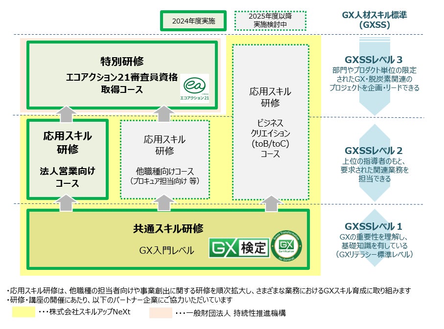 「環境分野スキル育成プログラム」は、GXリーグにおける「GX人材市場創造ワーキング・グループ」で代表リーダー企業を務める株式会社スキルアップNeXt(※7)と共に制作し、GXSSレベル1に相当するGXの重要性を理解し基礎知識を有するための「共通スキル研修」と、GXSSレベル2に相当する上位の指導者のもと要求された関連業務を担当できるようになるための「応用スキル研修」で構成されています。