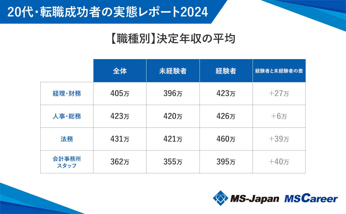 また、未経験者と経験者の年収の差が最も大きいのは「会計事務所スタッフ」で、その差は40万円という結果となりました。