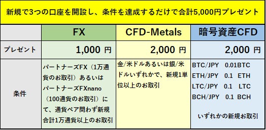 株式会社 マネーパートナーズ(代表取締役社長:福島秀治、本社:東京都港区、以下「当社」)は、2022年5月の新規口座開設者向けキャンペーンとして、「外国為替証拠金取引(FX)」、「CFD-Metals」、「暗号資産CFD」の各サービスの新規口座開設と条件達成で合計5,000円をプレゼントするキャンペーンを実施いたします。