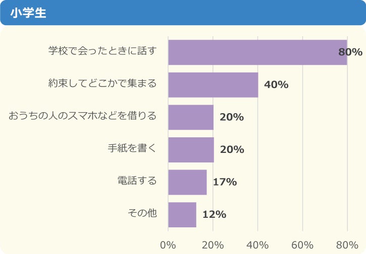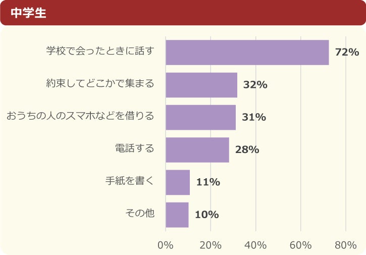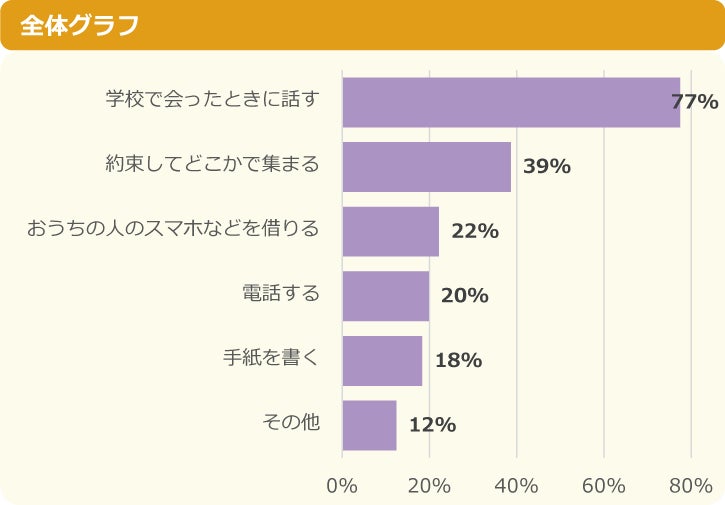 最も多かった回答は「学校で会った時に話す」で、全体の77%でした。小学生も中学生も3位までは同じ順でしたが、4位以下が異なりました。