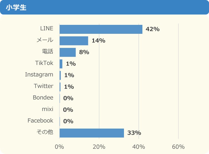 2022年の回答(注1)でも「LINE」で連絡を取り合っている人が最多でした。2022年は全体で47%、小学生で39%、中学生で66%だったので、全体的に増えていることがわかりました。