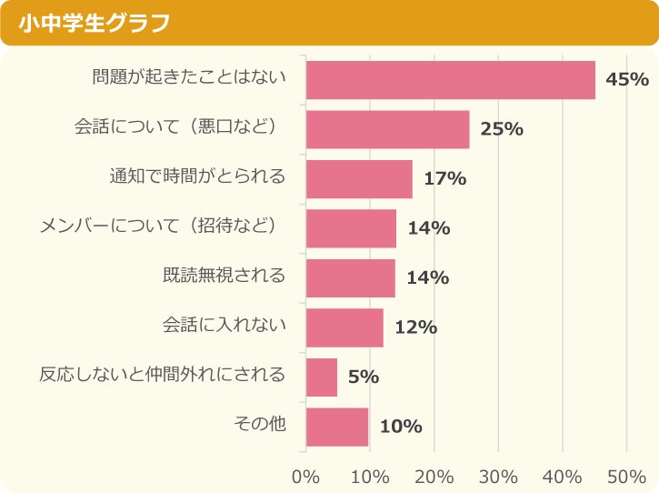 LINEなどのSNSで友だち同士のグループチャットに入っているかという質問には、「入っている」と答えた小学生が35%で、中学生は62%でした。グループチャットでの問題については、「問題は起きたことがない」が45%で最多でした。「会話について(悪口など)」「通知に時間がとられる」「メンバーについて(招待など)」との回答が上位となりました。