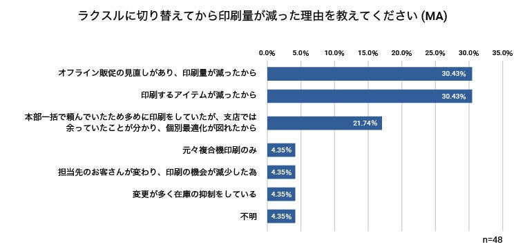 「オフライン販促の見直しがあり、印刷量が減ったから、印刷するアイテムが減ったから(30.43%)」、「本部一括で頼んでいたため多めに印刷をしていたが、支店では余っていたことが分かり、個別最適化が図れたから(21.74%)」という結果に。