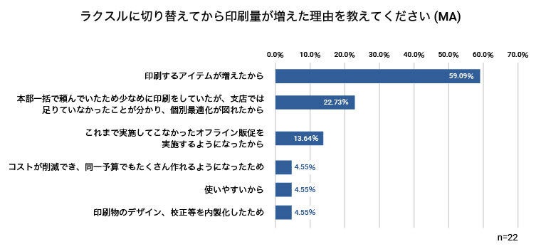 「印刷するアイテムが増えたから(59.09%)」、次いで「本部一括で頼んでいたため少なめに印刷をしていたが、支店では足りていなかったことが分かり、個別最適化が図れたから(22.73%)」という結果に。