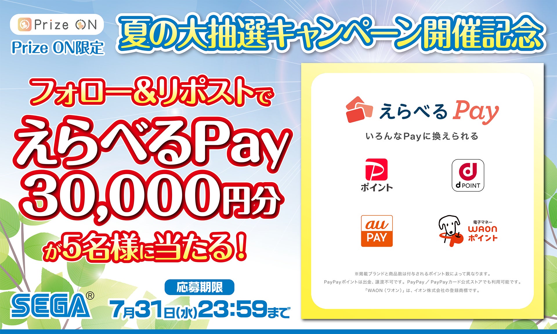 7月1日(月)より、Prize ON公式アカウント(https://twitter.com/PrizeON1201) をフォローし、対象の投稿をリポストいただくと『えらべるPay(30,000円分)』が抽選で5名様に当たるフォロー&リポストキャンペーンを開催いたします。