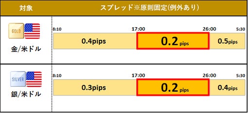 CFD-Metalsにおいて、ゴールデンマネパタイム(17時~26時)に「金/米ドル 0.2pips」「銀/米ドル 0.2pips」と業界最狭水準スプレッドを提示いたします。原則固定(例外あり)