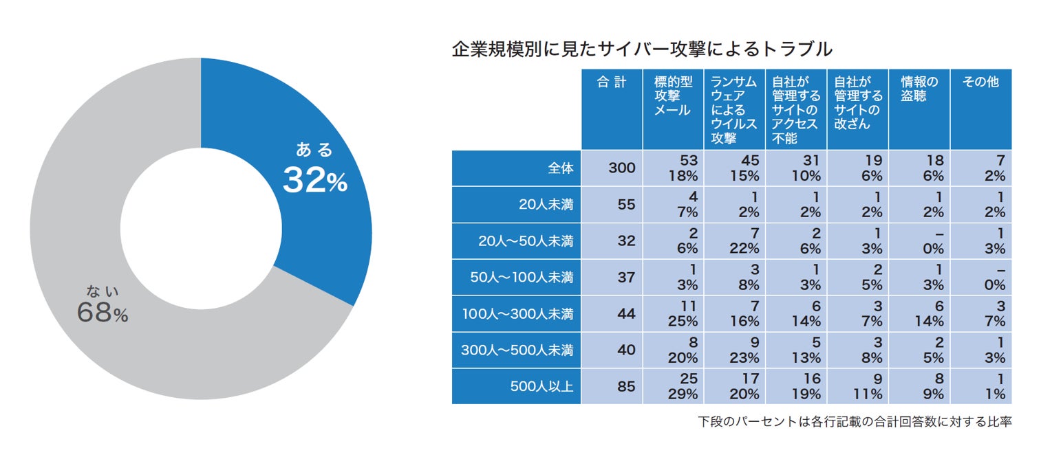調査対象企業の32%が、サイバー攻撃に起因するトラブルを経験しています。特に「標的型攻撃メール」や「ランサムウェア」が主要な脅威となっており、従業員数が多い企業ほどその傾向が強くなっています。