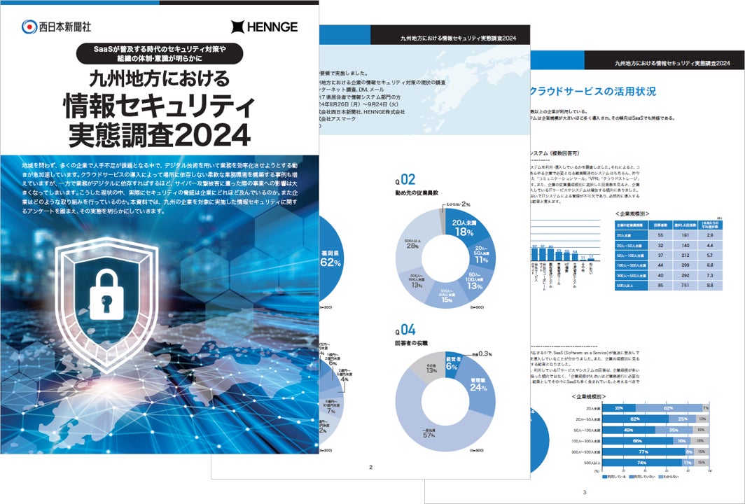 株式会社西日本新聞社(本社:福岡県福岡市、代表取締役社長:田川 大介)は、九州地方における企業の情報セキュリティ対策の現状の把握のため、HENNGE株式会社(本社:東京都、代表取締役社長:小椋 一宏)と共同で、九州7県居住者で情報システム部門の方300名を対象に、情報セキュリティの実態を調査しました。この調査では、SaaSが普及する時代の企業のセキュリティ対策や組織の体制や意識を明らかにしています。