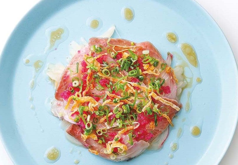佐賀県のわさび園多良岳わさびで作ったドレッシングと、紅芯大根おろしで仕上げました。